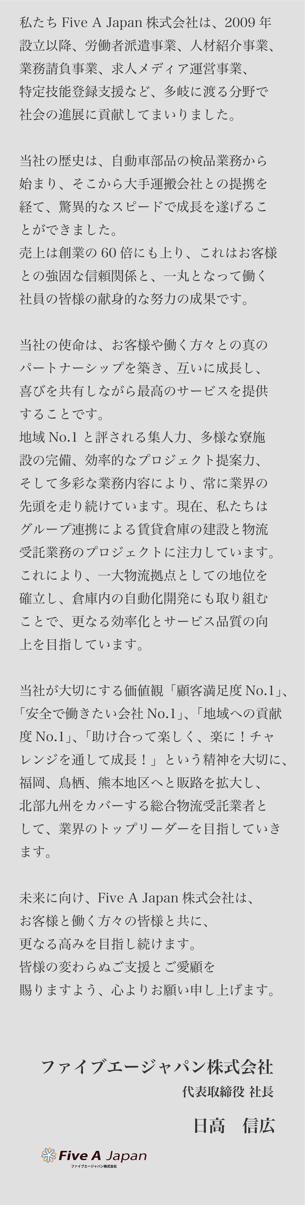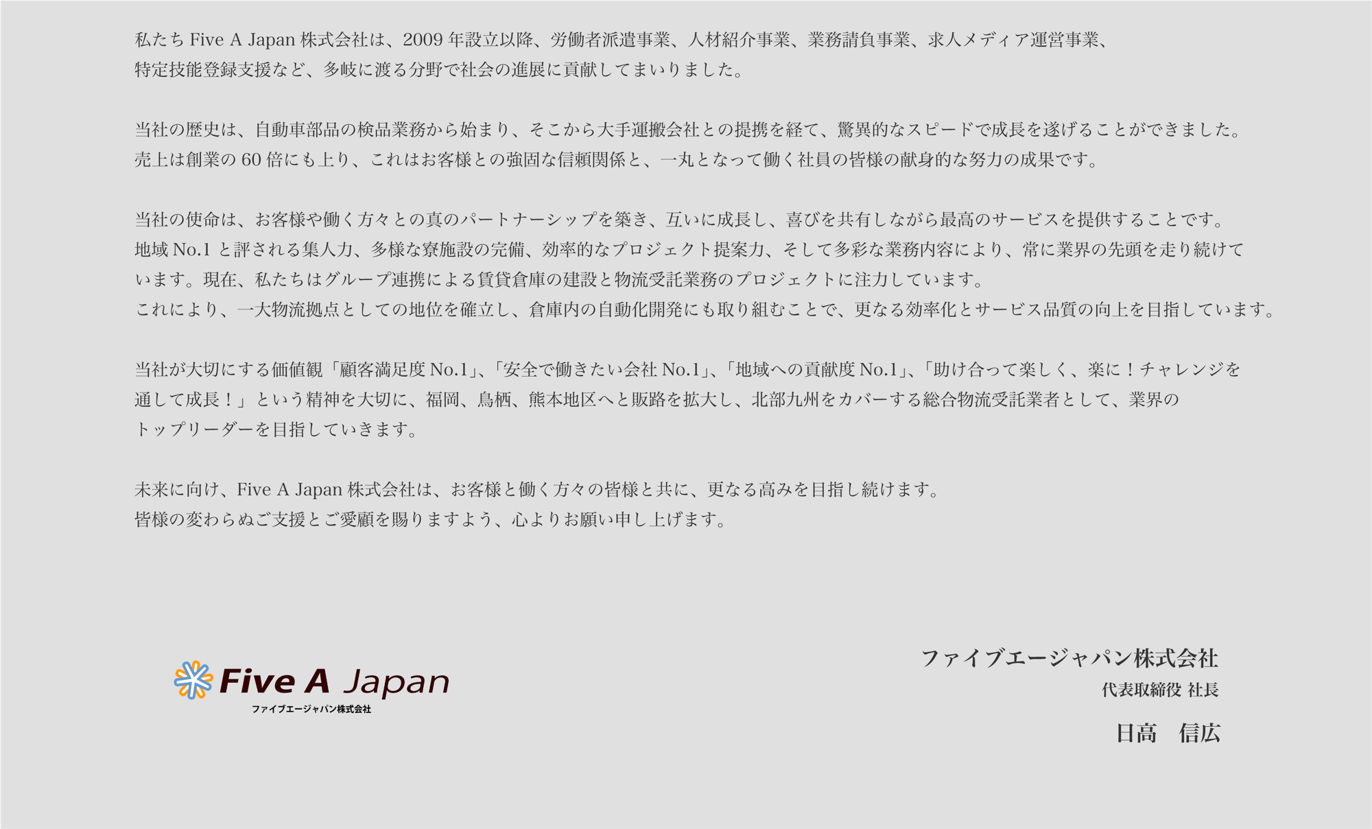 代表メッセージ - 福岡県の人材派遣会社はファイブエージャパン株式会社